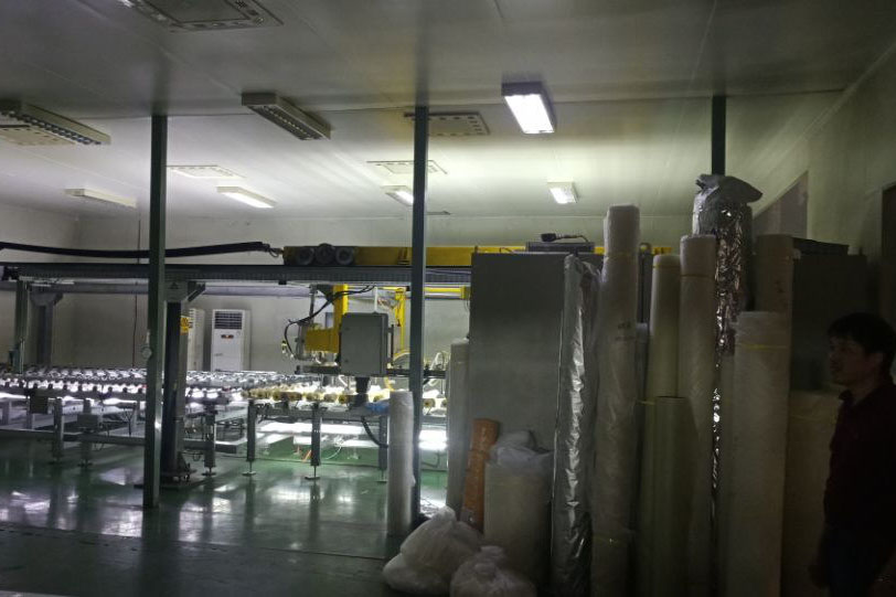 400立方车间流水线作业,因现场室内相对湿度值较高,已超出室内要求上限,在玻璃合片过程中,玻璃覆膜容易受环境因素影响,吸附到空气中水份,在合片完毕后,玻璃覆膜上容易出现气泡,严重影响生产品质与生产进度。